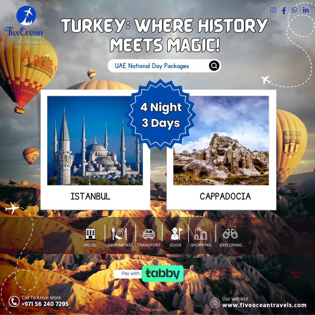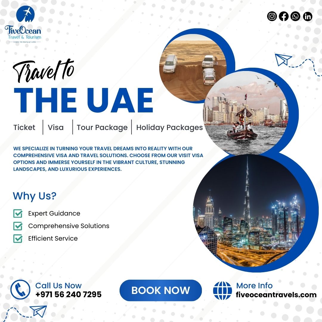 Five Ocean Travel & Tourism LLC, a leading travel agency in Sharjah, UAE, has been delivering exceptional travel experiences since 2015. We offer a wide range of services, including holiday packages, domestic and international tours, UAE tours, visa services for the UAE and global destinations, flight tickets, and more. With a commitment to excellence and customer satisfaction, we've established ourselves as a trusted name in the travel industry. Whether you're looking for a relaxing getaway or an adventure-filled journey, our expert team is dedicated to crafting unforgettable experiences that exceed your expectations.